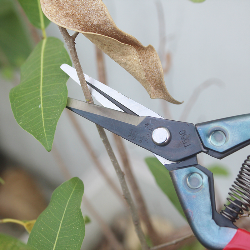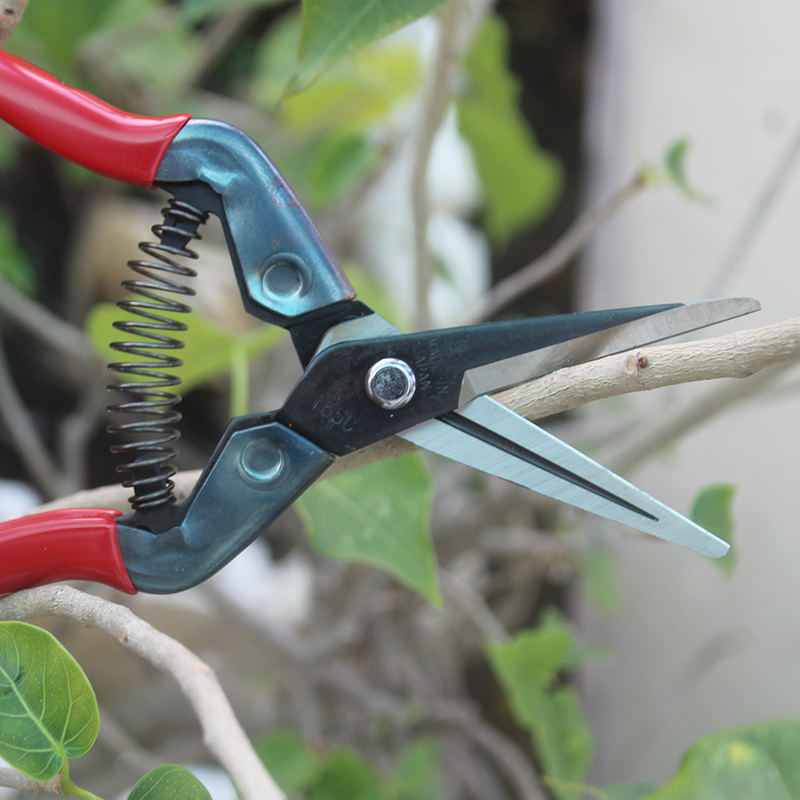 Chikamasa S-2C có lưỡi cong nhẹ giảm độ trượt khi cắt tỉa và mũi kéo không nhọn hạn chế làm trầy xước các nhánh lá.